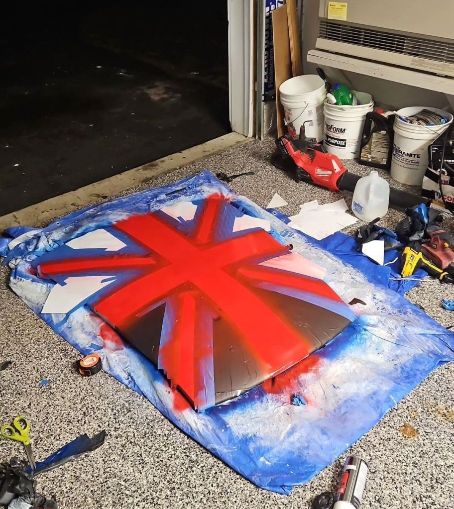 If you’ve ever seen a picture of my car, you know that it’s got the Union Jack on the hood. It’s fairly hard to miss. However, one thing not many people know is that it was made up of blue and white masking tape over a red hood! That tape (having been applied several years ago) was starting to show its age, and so I bit the bullet and painted the Union Jack on a spare hood taken off my parts car. It came out quite well, but I haven’t been able to fit the second hood yet, and so the tape gets a few more weeks on the car. The flag on the hood was a huge hit at car shows, but now I’ll no longer have to deal with getting yelled at about how “That’s gonna ruin your paint,” and the like.