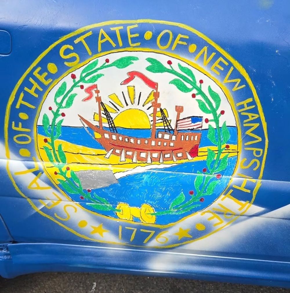 However, once the base coat was done, things could sail a bit smoother. I painted white mountains, representing NH’s white mountain range, on the side of the car with a rattle can and a cardboard template. It came out shockingly good for what it was. We signed up wicked early to secure the number 603, and painted it on both sides of the car with yet another cardboard template, albeit a bit more complex this time! I painted the NH state seal (the main feature of the state flag) on the rear door with posca markers, which, once again, came out way better than it had any right to. One thing that kind of shocked me was how kindly the oil-based posca markers took to clear coat. No bleeding or issues whatsoever.